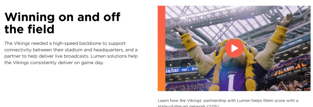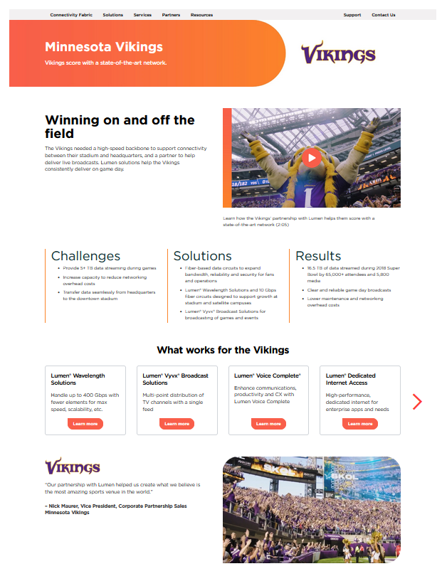 This page was an effort based in customers and meetings with sales representatives to sneak up on the essence of the solution-specific partnership between the Minnesota Vikings and Lumen.